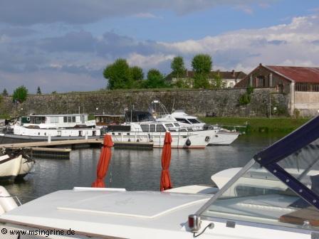Tag 2 Fr 2.5.2014 Markttag in Auxonne Der Morgen begrüßte uns mit leichter Bewölkung, die Luft war kalt, aber der Sonnenschein hatte die Oberhand. Also ein perfekter Tag zum Bummeln, wenn das Wetter sich nur halten würde. Draußen war alles wieder wie gewohnt, der normale Alltag hatte uns wieder, selbst die Boote, die gestern im Hafen eine Zwangspause einlegen mussten, waren wieder unterwegs. Die Einkaufsliste wurde grob zusammengestellt und nach dem Bunkern von Frischwasser konnte es los in die Stadt gehen. Um die Kirche waren die Marktbuden aufgebaut, kleinere Nebenstraßen waren abgesperrt, aber die Hauptstraße war frei. Nach nur ein paar hundert Metern waren wir am Casino und es folgte Teil I der Einkaufstour. Die Hauptbestandteile für die Verpflegung der nächsten Tage landete im Einkaufswagen und dann an der Kasse. Alles wurde im Auto verstaut und dann ging es zu Fuß zu Teil II , dem Marktbesuch. Das Auto wurde einfach auf dem Parkplatz vom Supermarkt gelassen und die wenigen Meter zum Marktplatz waren schnell hinter uns gelassen worden. |