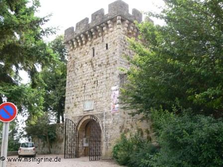 Durch das Tor in der Wehrmauer gelangt man über eine Art Abkürzung an die Hauptstraße, die aus dem Ort den Hang hochführt.