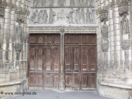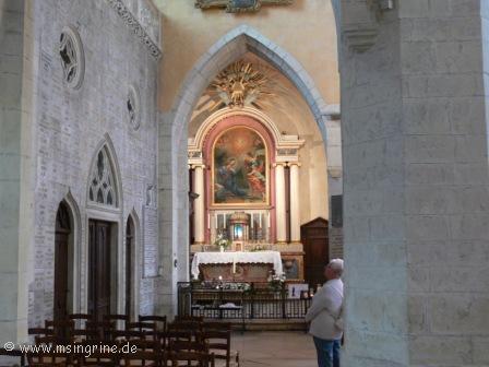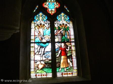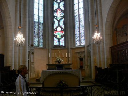 Im Innern wieder sehr viel bunte Glaskunst, hier das Thema Domrémy la Pucelle, bezogen auf die kleine Gemeinde gleichen Namens im Département Vosges als Geburtsort von Jean d´Arc, úns besser bekannt als der Jungfrau von Orleans.