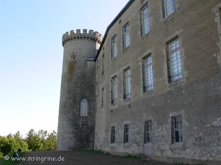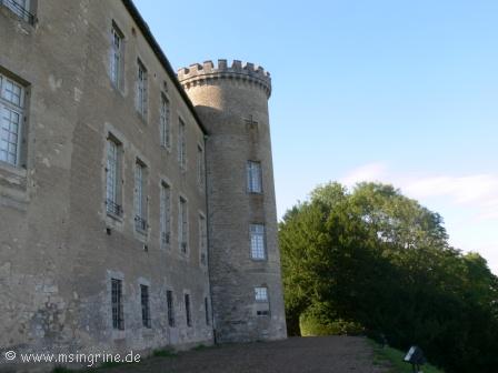 Durch den schattigen Park erlangten wir zuerst den Blick auf den Seitenflügel des Chateaus mit dem noch erhaltenen Wehrturm.