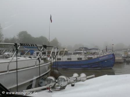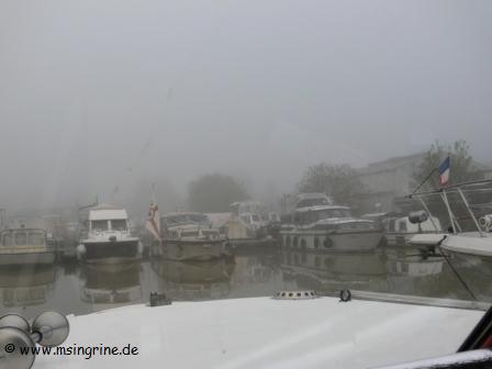 Gegen 8°° ging es zu Hause los, die Autobahn war frei und ich kam gut vorwärts. Hinter Euskirchen gab es auf dem Weg nach Bitburg stellenweise dichten Nebel, zum Glück war nicht viel Verkehr. Hier oben in der Eifel ging die Temperatur runter bis auf 3° C , ich hätte doch nicht mehr gedacht, dass die Frostwarnung noch einmal angeht. Die Feuchte vom Nebel ging dann allmählich in Nieselregen über, war nicht so angenehm. Dafür das Tanken in Luxembourg schon, dort kostete der Liter Diesel 1,187 , so macht tanken noch Spaß. Hinter Luxembourg wurde die Bahn dann voller, sehr viele Holländer waren unterwegs, wie üblich im Rudeltrödeln, kaum schneller als 110, man könnte ja mit dem Ausscheren warten, bis der Ankommende vorbei ist . . . Nancy war trotz allem schnell erreicht, kurz vor der Trennung zur Autobahn gab es dann allerdings mehrfach Stau bis zum Stillstand, rückstauender Verkehr von der Zahlstation. Es machte richtig Spaß, an der ganzen wartenden Horde von Touristen vorbei zu ziehen und in die Sonderspur der Telepeage zu fahren. Bis Langres war es dann doch etwas nervig auf der Bahn, sehr sehr viel Verkehr, hatten wir auf dieser Strecke auf der Hinfahrt so noch nie erlebt. Leider wurde der Regen nicht weniger, auch nicht hinter der Ausfahrt Richtung Champlite. Dafür war hier die Straße wieder frei, nur ein paar wenige Autos auf der Strecke Richtung Gray. Der Abzweig über die Dörfer war schnell erreicht, bei der Überquerrung der Salon traute ich den Augen kaum, noch höherer Wasserstand als beim Hochwasser vor zwei Wochen. Das bestätigte sich dann auch später im Hafen, die Stege zu den Pontons standen alle auf "Bergauf". 13:05 war Ankunft in Dampierre, hinein in den Intermarche und Proviant besorgt für die nächsten Tage. Ab zum Boot und ausladen, allerdings in Raten, da es nach wie vor am Regnen war. Die Arcadia wirkt bewohnt, allerdings sind John und Doreen nicht zu sehen, es steht auch kein Auto dort. Wird sich zeigen, vielleicht sind sie zum Einkaufen. Auf dem Boot selber sieht soweit alles gut aus, Heizung angeworfen und dann den Tag mit rumkrösen ausklingen lassen. Später erfolgt nach Meldung via Skype nach Düsseldorf.