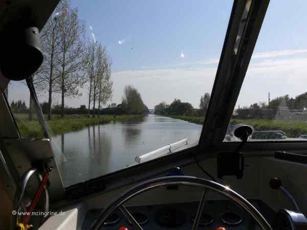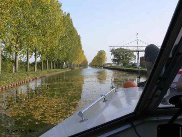 Über Nacht war das Wasser im Kanal ca. 25 cm gefallen, ein Schütz in einer Schleuse war wohl nicht richtig zu. Wir hatten kaum noch Spielraum zum Grund, aber wegen des geringen Tiefganges kamen wir gut frei. Nicht so ein anderes Schiff, das am Tag zuvor den letzten Teil der Strecke mit uns gefahren war, es lag auf Grund und stand Achtern aus dem Wasser. Wir wurden vom Schiffsführer um Hilfe gebeten. Die Tampen wurden übergeben und vorsichtig wurde versucht, das Schiff aus dem Uferschlamm zu ziehen. Drei Anläufe waren nötig, dann hatten wir es frei.