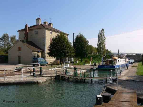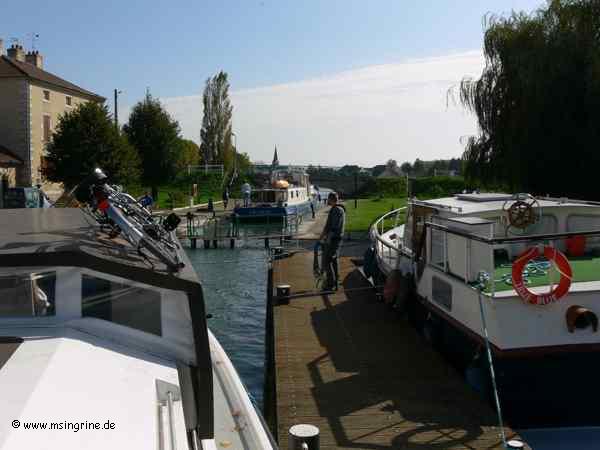 Am nächsten Wochenende ging es mit Sohn Frederik nach Dijon, der Rest des Canal de Bourgogne soll bezwungen werden. Etappenziel : der Freizeithafen von Saint-Jean-de-Losne an der Mündung des Kanals in die Saône. Lebensmittel für das Wochenende wurden gekauft, Wasser wurde gebunkert, Treibstoffstand geprüft und dann ging es bei Sonnenschein los. Unmittelbar an der Hafenausfahrt die erste Schleuse auf den 29 Km.