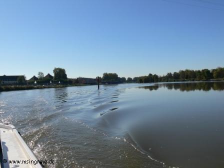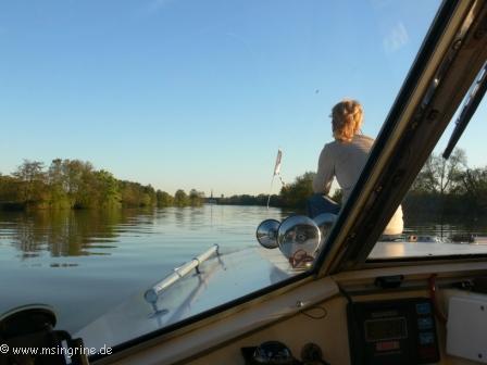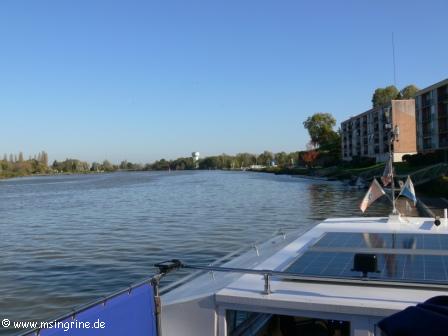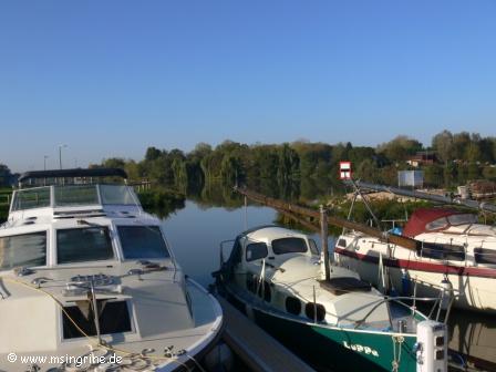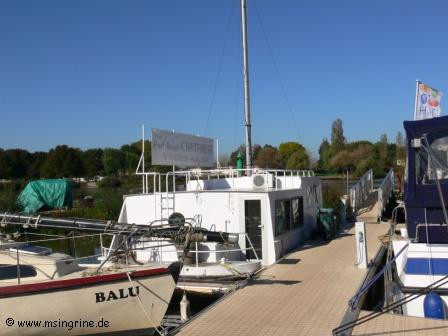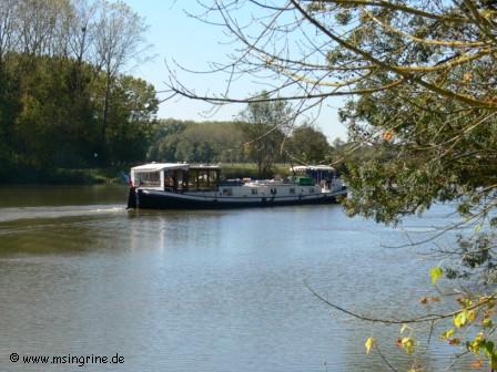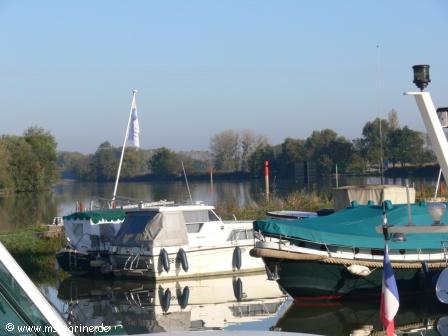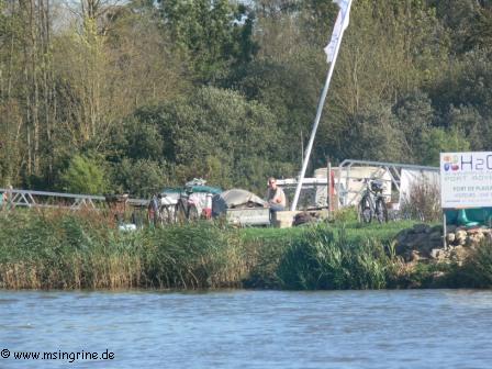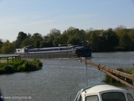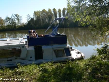 Aber es gab auch andere Anzeichen : Roy hatte das Dach vom Sanitärdampfer leergeräumt, der soll zur Renovierung in der nächsten Zeit zur Werkstatt nach Saint Jean de Losne gebracht werden. Zur Mittagszeit haben wir dann mit der Ingrine eine der letzten Ausfahrten für dieses Jahr gestartet. Auf dem Fluß war absolut tote Hose, da muß doch wenigstens ein Boot unterwegs sein . . . Sogar ein Schiff war dann doch noch unterwegs, es lag später bei uns im Hafen. Hinter der Baumreihe am Ufer war eine Brunnenanlage vom Wasserversorger Suez. Die angrenzende Wiese dahinter war riesig, wurde aber nicht für die Viehhaltung genutzt. Kurz vor 18°° wurde dann die Rückfahrt angetreten. Die Saône war spiegelglatt und ruhig, heute waren die Krachmacher mit Wasserski und Wassermotorrädern nicht unterwegs, eine Wohltat. Auxonne kam in Sicht und so ging der Tag dann langsam zu Ende. Das ausgefallene Grillen wurde dann im Hafen nachgeholt. Am gegenüberliegendem Ufer war ein einsamer Angler zu sehen. Dafür hörte man ab und zu einen Knall, die Jagdsaison war wohl eröffnet, vielleicht sind deswegen so wenige Angler unterwegs ? ? Der Parkplatz war auch ziemlich leer geworden. Helga ging am Vormittag noch ein paar Sachen einkaufen und ich fuhr alleine runter zum Stadtanleger, um sie dort abzufangen. Ansonsten war ich am Stadtanleger komplett alleine. Und dann kam doch tatsächlich ein Mietboot vorbeigerauscht ! ! ! Wohl eines der letzten in diesem Jahr. Bevor es zurück nach Düsseldorf ging kam noch ein Frachter in Bergfahrt vorbei, die VERIDIS QUO, das frage ich mich auch. |