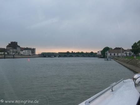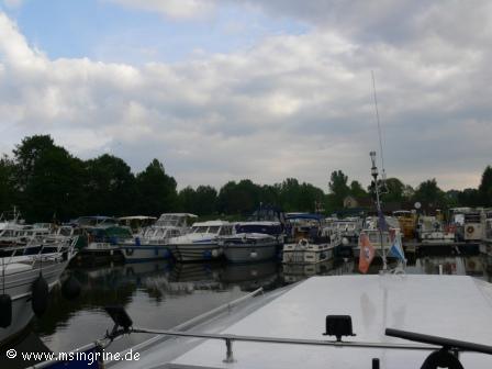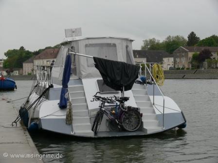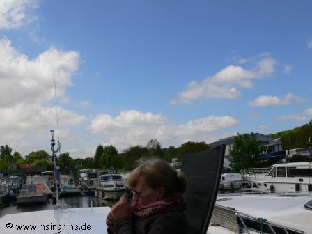 Wir haben dann den ganzen Tag hier am Kai verbracht und uns vom Liegestuhl aus das Treiben an Land angesehen, war wie in einem Straßencafe, es gab immer etwas zu sehen. Am Nachmittag machte dann noch ein Boot hinter uns fest, das in unseren Augen nicht nur potthässlich war, sondern auch für den Fluss- und Kanalbereich mit seinen Schleusen total ungeeignet. Es bedurfte einiger akrobatischen Verrenkungen, um vom Boot an Land zu kommen und auch später zurück.
