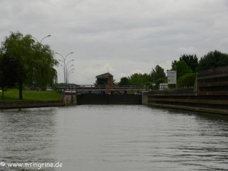 Die Schleuse von Ormes kommt in Sicht, sie liegt etwa 5 Km unterhalb der alten Schleuse von Gigny. Blinklichter warnen einem davor, rechts über den Damm zu fahren, der hier unmittelbar an der Schleuse liegt.