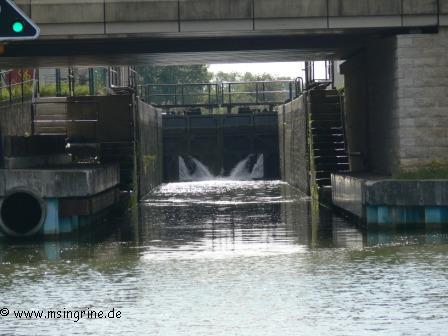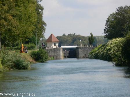 Im Bereich der Schleuse ist man dann bereits Nahe der Altstadt, die Schleusenausfahrt führt an der alten Mühle und der Befestigungsmauer vorbei.