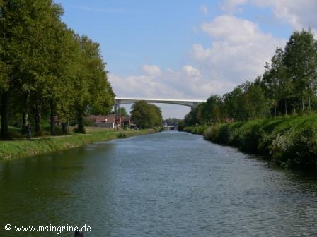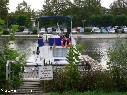 Tag 7 Von Abergement-la-Ronce nach Dole Nach dem Grillen haben wir noch sehr lange oben an Deck gesessen, danach war es wie erwartet eine sehr ruhige Nacht. Bereits um 8°° hatten wir einen strahlend blauen Himmel, der versprach viel Gutes. Wenn die Bäume sich in ein paar Jahren entwickelt haben wird das ein noch schönerer Platz werden. Die leichten Hügel mit den Wildblumen, die hier angelegt wurden sind jetzt schon eine kleine Oase. Nach der ersten Schleuse durchfuhren wir auf etwa 4 Km das Gebiet der Fabrik Solvay, hier herrscht aus Sicherheitsgründen absolutes Halte- und Anlegeverbot. An dem linken Ufer war ein riesiges Areal mit Klär- und Ablagebecken, den Bassin de Décontation. Auch mit Aufpreis würde mir nicht einfallen, hier zu rasten. Der Geruch entlang des Kanals war dafür, zumindest an diesem Tag, erträglich. Selbst der blaue Himmel verbessert die Lage nicht wesentlich. Dafür war einen größerer Bereich für die Bahnverladung vorhanden. Mit erreichen der Autobahnbrücke der A 39 , der grünen Autobahn, hat man dann das Gelände von Solvay hinter sich und man kann wieder voll die Natur genießen. Sehr ruhig gelegen, von der Autobahn in drei Kilometern Entfernung bekommt man hier nichts mit. Ein etwas größeres Anwesen, war vieleicht einmal ein Gutshaus?? Die neue Brücke führt die D 405 über die Corniche, im Hintergrund die Ausgangsschleuse auf den Doubs. Nach der Schutzschleuse geht es zum ersten Mal raus auf den Doubs, allerdings nur für 2 Kilometer, dann zweigt der Kanalverlauf links ab. In der Zufahrt zur Schleuse kommt von links (hier nicht sichtbar) die Wasserführung von der alten Mühle, sie wird als Wildwasserbahn von Kanuten benutzt. 250 m weiter liegt dann die Basis von Nicols. Den oberen Bereich darf man als Gastlieger benutzten, Strom und Wasser sind am Steg vorhanden. Die Liegegebühr ist vom Preis her in Ordnung, wenn man bedenkt, das man zu Fuß direkt in der Altstadt ist. Die Basis liegt an einer Grünanlage, die hinter der Brücke Pont Louis XV in die Parkanlage übergeht, die sich den Hügel hoch zieht. Dort oben steht auch das Denkmal, das an den berühmten Sohn der Stad Louis Pasteur, erinnert. Sehr Lustig ist auch das Pizza-Boot am anderen Ufer. Per Telefon bestellt, wird mit einem Motorroller die frische Pizza ausgeliefert. Das ist allerdings gestellt, man sollte die Cognacflasche vorher aufdrehen . . . Na denn , zum Wohl ! ! ! Tag 8 Stadtrundgang in Dole