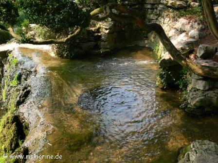 Der aus den Quellen gebildete kleine Bach schlängelt sich den hang herunter, man kreuzt ihn mehrfach entweder über kleine Brücken oder durch eine Fuhrt.