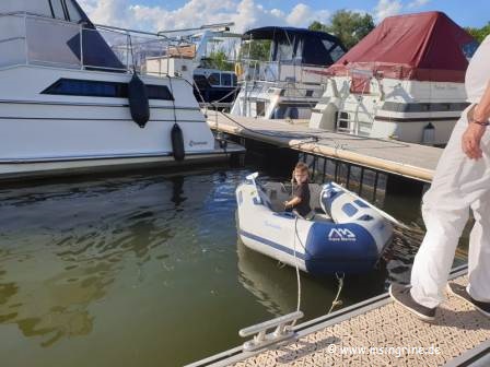 Abstoßen vom Steg, Aufstoppen der Leine und zurück an den Steg ziehen.