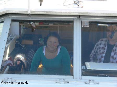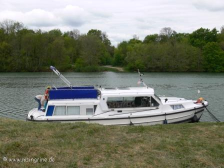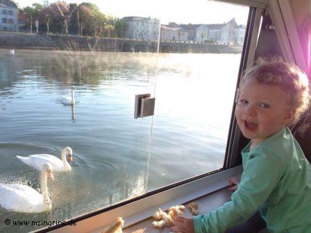 An Bord war noch alles ziemlich ruhig geblieben und so zog ich mich mit meinem Pott Kaffee auf das Nildeck zurück und genoss die frische Luft draußen. Am Abend waren keine weiteren Boote mehr gekommen und es war sehr ruhig geblieben. Und wie es ist wenn man am Wasser sein Brot zu deutlich am Fenster hält, ruck zuck gab es Zaungäste. Mira war begeistert vom Fenster aus die Schwäne zu füttern. Sie erklärte später alle Schwäne zu ihren Freunden. Zum Glück gab es vom Vortag genug alte Brotreste an Bord, die wir immer vorsorglich sammeln, man ahnt ja nie, wer gerade mal vorbeischaut. Und dann gab es wieder die Order Schwimmweste an, Signalpfeifentest und ab aufs Oberdeck, klar zum Ablegen um 10:05. Unser 2. Steuermann fühlte sich wohl und sah überhaupt keinen Grund in das Geschehen einzugreifen. Volles Vertrauen zur Schiffsleitung. Er darf wiederkommen. Derweil machte sich Mama Denise daran, das Ruder zu übernehmen, was sie gut meisterte. Ist ja auch etwas wie Autofahren. Unser 2. Steuermann wollte sich dann doch einmal über den gerade anliegenden Kurs und die Drift informieren, war aber sehr schnell zufrieden und gab sich wieder seiner Flasche hin. Der selbe Text 30 Jahre später wäre schon bedenklich . . . ![]() Ich hatte dann die Zeit hochgerechnet und dann für eine längere Mittagspause am Engländersteg bei Pesmes plädiert, so konnte Mira auch noch an Land herumtoben. Um 12:25 lagen wir dort am Steg. Wir waren dort alleine und so konnten wir auch ziemlich viel Blödsinn veranstalten. Leider waren dann doch noch ein paar Wolken aufgezogen, aber es blieb zumindest trocken. Längere Zeit konnte man ein monotones Tuckern hören, und dann kam ein größerer Kahn um die Ecke. Es war die Avanti II von VnF, die hier im Uferbereich alte Bäume und Stümpfe entfernte, später kam noch ein Kollege mit einem Häxler dazu. Um 14:20 legten wir dann für die restlichen paar Kilometer ab. Dann war es soweit, Auxonne man in Sicht. Unser Hafenplatz war im Vorfeld von mir bestellt und reserviert worden und Roy und Carol kamen wie immer um uns zu begrüßen und um uns in Empfang zu nehmen. Um17:30 wurde dann die Maschine abgestellt, willkommen im Port Royal. weiter mit dem Sonntag geht es hier . . . . |
