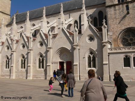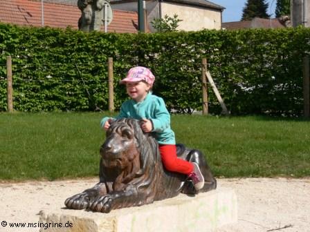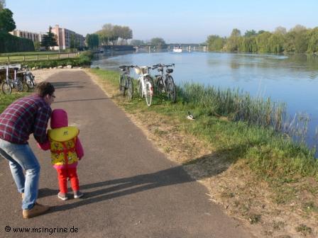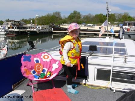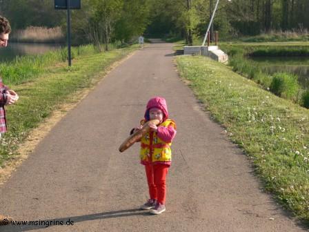 Tag 4 So 20.4.2014 Sonnenschein für die Rückreise Heute ist es nun leider so weit, Ingo und Denise müssen zurück nach Deutschland, Ingo hat am Folgetag Frühschicht. Der Tag zeigte sich bereits am Morgen von der besten Seite, in der Ferne lag über der Saône leichter Nebel, es schien als ob die Tonnen in der Luft schwebten. Helga machte sich auf um frisches Brot für das letzte gemeinsame Frühstück zu holen. Ingo war am Land unterwegs gewesen und holte Mira nach, da er eine Ente mit Jungtieren entdeckt hatte. Der Vater der kleinen Familie saß auf der anderen Seite in der Wiese um von den Küken abzulenken. In der Zwischenzeit war Helga mit dem Brot zurück und Mira wollte unbedingt tragen helfen. Es steckt halt in jedem ein kleiner Franzose. Hier ein Bild von der Ingrine im Hafen von Auxonne, nur wenige Plätze neben der Hazelwood von Roy und Carol. Vor der Rückfahrt wollten Denise und Ingo noch in die Stadt für eine kleine Erkundung, das Wetter war ja auch prächtig und bis Mittags hatten sie noch Zeit. Also sind wir alle zusammen für einen kleinen Rundgang in die Stadt gegangen. Wir kamen auch pünktlich zur Ostermesse auf dem Kirchplatz an, die Glocken läuteten von beiden Türmen und die Kirchenbesucher sammelten sich auf dem Vorplatz. Die in den letzten Jahren renovierte Fassade erleuchtete im Sonnenlicht, ein schöner Anblick. Denise und Helga wollen noch schnell in einen Supermarkt springen, derweil bin ich mit Ingo und den Kindern in den kleinen Park an der Porte de Comté um uns die Zeit zu vertreiben. Mira musste natürlich die kleine Treppe an der Seite erklimmen. Durch die Rue Emile Gruet und die Rue Antoine Masson ging es dann die Hauptstraße herunter an die Saône. Jetzt zur Mittagszeit waren auch einige Boote am Stadtsteg, vielleicht auch nur zur Mittagspause. Dann kam der Abschied. Mira wurde befragt und wie an den Vortagen auch wollte sie noch gerne bei uns auf dem Boot bleiben, wir hatten ja noch einen Tag mehr Zeit. Ich bin dann mit Denise und Ingo nach Savoyeux gefahren, um mein Auto zu holen. Danach habe ich die Beiden zur Autobahn gelotst und bin selber über die Autobahn nach Auxonne gefahren, ca. 45 Min. Fahrt und ich war dort. Zum Abend hin sind wir dann noch spazieren gegangen, Enten gucken, Blumen riechen und natürlich Pusteblumen pusten. Am Wegesrand und an den kleinen Wiesen neben dem Feldweg gab es so viele bunte Blumen, die mussten auch gepflückt werden. Dann spielten wir noch im Boot, ein Stück Isolierband musste als Pflaster herhalten und Mira klebte sich das Pflaster an die unmöglichsten Stellen, obwohl sie zuerst gar nicht von Pflastern angetan war. Dann ging es ab in die Kiste, morgen ist auch noch ein Tag. |