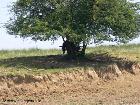 Ein einsamer Esel sucht etwas Schatten unter einem Baum am Ufer.