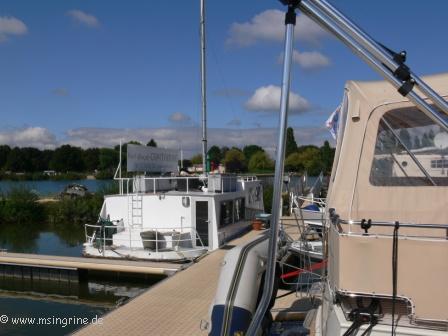 Am vorderen Ende des Pontons liegt ein altes Mietboot, das zur Capitainerie umgebaut worden ist.