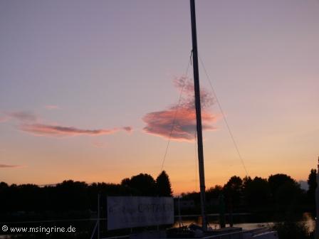 Tag 1 Sa 16.8.2014 Alleine zum Boot Helga fehlte 1 Tag Urlaub an 2 Wochen und so gab es Überlegungen, ob ich alleine zum Boot voraus fahre und alles herrichte oder ob wir zusammen nach Frankreich fahren und ich dadurch 3 Tage im Vorfeld verliere. Da im Frühjahr das Nachkommen per Flieger gut funktionierte haben wir uns erneut dazu entschloßen. So konnte ich die ersten Tage am Boot dazu nutzen, um Einkäufe zu besorgen, Gefrierschrank zu starten und die Liegestühle zu testen. Für Mitte August war es das perfekte Wetter, man konnte lange am Abend draußen sitzen und die Luft geniessen. Tag 2 So 17.8.2014 Alleine zum Grillplatz Am Morgen hatten wir uns zum Telefonat verabredet. Und über die Web Cam wurde genau beobachtet, was ich da so treibe . . . Auf dem Treidelweg hinter dem Ufer konnte man noch die Spuren sehen, den der Sturm in der letzten Zeit verursacht hat, überall lagen noch Äste herum. Kurz vor 19°° bin ich in den Hafen zurück gekehrt, wie an jedem Wochenende war nicht so viel Betrieb am Gastlieger. Und um 21°° habe ich dann mit dem Sonnenuntergang meine Aufzeichnungen beendet. Morgen ist ja auch noch ein Tag. Tag 3 Mo 18.8.2014 Alleine zum Flugplatz Helga musste heute den Tag noch arbeiten, da ihr 1 Urlaubstag fehlte. Direkt nach der Arbeit ist sie zum Flughafen gefahren um dann mit dem Flieger nach Basel / Mulhouse zukommen. Ich habe mich gegen 18°° auf den Weg gemacht, um sie dort abzuholen. Die Fahrt war gemütlich und entspannt, kaum Verkehr, Sommerwetter. Auf dem Vorfeld stand eine Super Constellation der Uhrenfirma Breitling, die mir beim letzten Besuch hier bereits aufgefallen war. Leider hatte ich damals den Fotoapparat nicht mit, deswegen hatte ich das diesmal eingeplant. Auf der anderen Seite des Rheintales konnte man eine Gewitterfront erkennen, die sich über dem Feldberg im Schwarzwald aufbaute. Das Grollen war in weiter Ferne nur schwach zu vernehmen, da der Betrieb auf dem Flugplatz dies übertönte. |