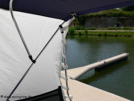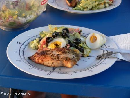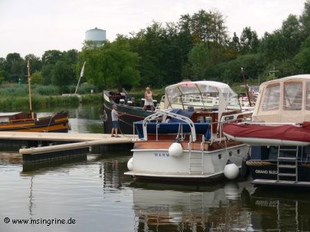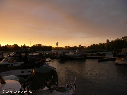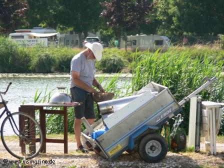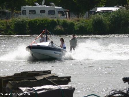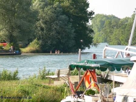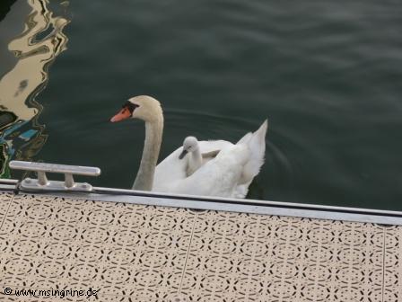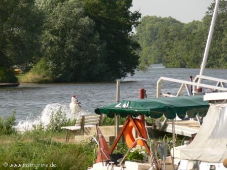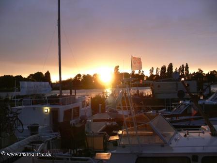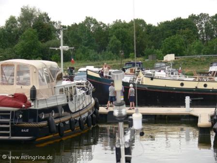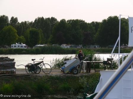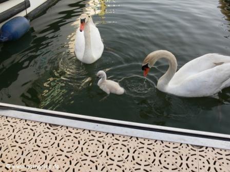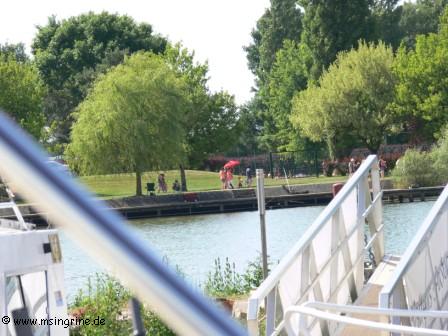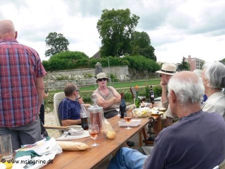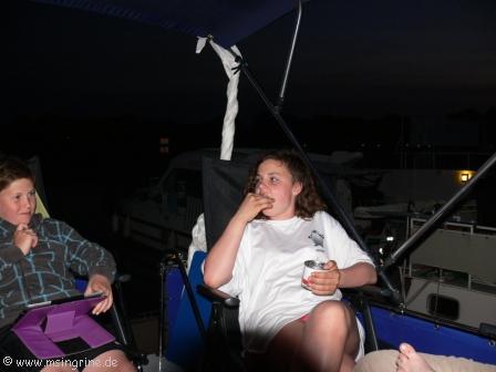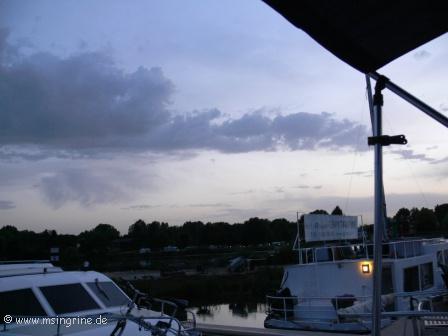Im Hafen war gut Betrieb, der Campingplatz auf der anderen Seite war auch recht voll, man merkte das Pfingstwochenende. Gegenüber hatte dann ein Angler einen kapitalen Hecht aus dem Wasser gezogen bzw. war beim Versuch dazu ins Wasser gefallen. Am Bootsclub waren den ganzen Nachmittag Kinder und Jugendliche im Wasser beim Baden, und selbst kurz vor 19°° war dort noch einiges los. Am oberen Ende vom Ponton hatte sich ein Gastlieger eingerichtet, Blumenschmuck wie vor der Haustüre zu Hause. Wir hatten dann ein paar Hähnchenfilets gegrillt, dazu hatte ich einen bunten Salat angerichtet, fertig. Später gab es noch den obligatorischen Käse als Abschluss dazu. Langsam entwickelte sich ein Plan, als uns Carol einen Strich durch die Rechnung machte. "Am Abend treffen wir uns alle vorne zum Grillen, kommt ihr auch?" Damit gab es heute keine Abfahrt mehr. Wir hatten dann noch ein paar Einkäufe getätigt, da wir zum Einstand im "Hafenclub" Tomaten-Bruschetta mitbringen wollten. Danach wurde das Sonnensegel gesetzt, damit wir etwas Schatten hatten. Am Nachmittag schob sich ein Hotelschiff am Hafen vorbei, die Quietude. Übersetzt "Ruhe", oder aus dem katalanischen "Stille", ein trefflicher Name für diese Urlaubsform zu Reisen. Gegen 17°° fing Roy damit an, die Grills zu reinigen und herzurichten. Für uns der Moment, mit den Vorbereitungen für die Bruschettas anzufangen. Die sollten ja schließlich auf dem Punkt genau fertig sein. Das Grillfest war pünktlich gestartet und der Umgang war sehr locker. Das war dann auch ein sehr schöner Abend geworden, wir hatten viele nette Leute kennen gelernt und waren gut in der Gruppe aufgenommen worden. Ab jetzt fühlten wir uns hier wirklich zu Hause. Der Nachwuchs wurde auch zeitweise Huckepack transportiert. Und immer sehr wachsam sein, ob nicht doch Gefahr lauern würde. Helga ging dann am Vormittag in die Stadt um ein paar Einkäufe zu erledigen. Wir hatten uns ein paar Tage zuvor eine Einkaufskarre gekauft, die sich als sehr praktisch erwiesen hat. Nach der Saison wollten wir sie nicht mehr missen. Wie auch an den Tagen zuvor konnten wir einen Hund beobachten, der sich im Hafenbecken im Wasser abkühlte. Frauchen saß derweil unter einem Baum im Schatten. Dann auf der nächsten Tour konnte man es wieder sehen, da fuhr ein Huhn hinter dem Boot hinterher. Was war das denn für ein Ritual ? Im Internet konnte ich dazu leider nichts finden. Es sah zumindest sehr lustig aus. In der Hafeneinfahrt hatte sich, evtl. durch die Wogen der Skifahrer herein getrieben, Treibholz angesammelt. Roy machte sich auf dem Weg, um das einzusammeln. Helga machte einen auf Anhalter und wurde von ihm mitgenommen. Dann ging es noch auf eine Erkundungstour raus aus dem Hafen, ob noch mehr Holz dort herumtreibt. . . . . für ein letztes Foto. Schaut mal, so mutig war ich gewesen. Vincent war sehr aufgeweckt und hatte bei uns angefragt und sich dann bei uns einen kleinen Angelköcher ausgeliehen. Immer wieder kam er bei uns vorbei um sich zu unterhalten oder um uns etwas zu erzählen. Bis 22:30 waren wir draußen sitzen geblieben, aber irgendwann ist dann auch mal Feierabend. Morgen ist auch noch ein Tag. Das dumpfe Geräusch von der alten Maschine lockte so manchen aus seiner Kabine, den man sonst am Tag weniger gesehen hatte. Es ist ja auch ein schöner Anblick, wenn dieses große Schiff in den Hafen einläuft und souverän an seinen Platz fährt. Man konnte genau erkennen, das dies nicht ihr erstes Anlegemanöver mit diesem großen Schiff war. Eingespielt und routiniert war das Verholen der Taue verlaufen. Um 21:20 zog sich der Himmel erneut verdächtig zu, gerade als das Licht der untergehenden Sonne den Hafen und die umliegenden Gebäude in goldenes Licht hüllte. Von unterhalb, von wo der Wind die Wolken hochgetrieben hatte, klarte es wieder auf. Auch Heute blieben wir von einem Gewitter verschont, obwohl es immer mal wieder am Abend danach aussah. Hier oben hatten wir einige Stellen am Ufer gefunden, an denen man hervorragend im Schatten liegen konnte. Das Wasser war mit 23° auch recht angenehm und so konnte man zum Abkühlen herrlich im Fluss baden. Es kamen auch nicht so viele Boote vorbei, sodass man die Ruhe hier genießen konnte. Im Hafen war es auch schön ruhig geblieben, wenig Neues war zu berichten. Mit altem Brot hatten wir dort oben ein par Enten und Schwäne gefüttert, sogar von Unterwasser kam ein Interessent, um an den Speisungen teilzunehmen. Um 19:25 waren wir vor Ort und hatten somit genug Zeit, um uns oben auf der Terrasse den Abfertigungsbetrieb noch etwas anzusehen. |