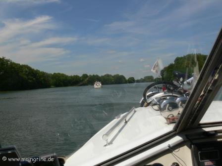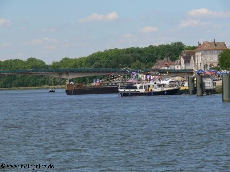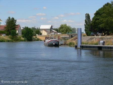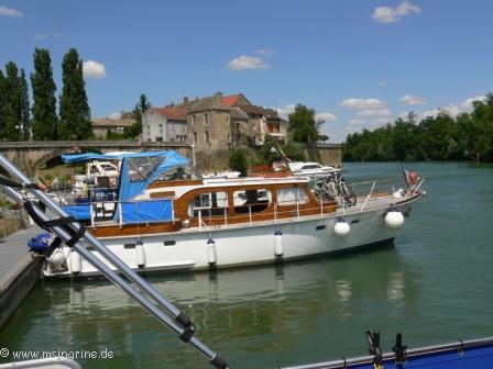 Tag 8 Sa 14.6.2014 Leinen los ! ! ! Die Nacht war ruhig und Alle hatten sich an Bord wohlgefühlt. Am Morgen gab es ein gutes Frühstück für unsere Gäste, dann wurde die Reise der nächsten Tage besprochen. Wir hatten für unsere Tourenetappen sehr viel Zeit und konnten es die kommenden Tage ganz gemütlich angehen lassen. Am späten Vormittag ging es auf große Fahrt und in der ersten Schleuse wurden wir bereits freudig von der Crew der MORA aus Corre begrüßt. Lukas hatte mich im Winter einmal angemailt, da er meine Webseite entdeckt hatte. Ein netter Kontakt. Vorbei ging es an den geschmückten Schiffen, die am Quai vertäut lagen. Im Hintergrund ist die ASTER zu sehen, ein alter Holzkahn, der früher auf dem Canal de Bourgogne unterwegs war und vom Schifferclub aufgekauft wurde. Die Restauration ist im vollen Gange und wir waren erstaunt, den Kahn hier liegen zu sehen. In der Zufahrt zum Canal de Bourgogne und zum Gare d´Eau lag die FRANCE an ihrem angestammten Liegeplatz. Auch hier wie auch an der Flußtankstelle war nichts los. Im Hafen von Pagny-le-Château lag nur ein einzelner Frachter, der aber gerade beladen wurde. Also aufgepasst, er kann in der nächsten Zeit hinter uns auftauchen, nach Norden sind die Schleusen nicht groß genug. Schließlich befahren wir seit der Schleuse von Auxonne eine Großschifffahrtsstraße.