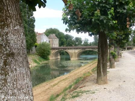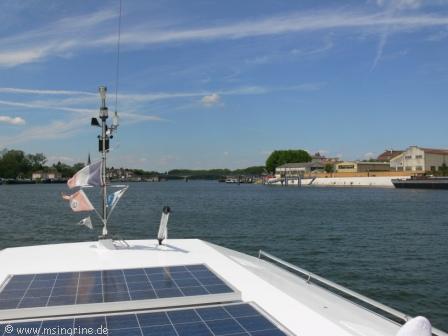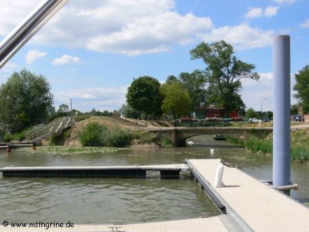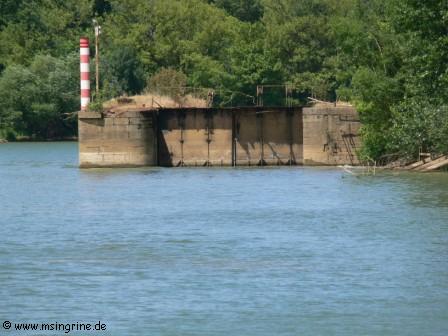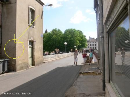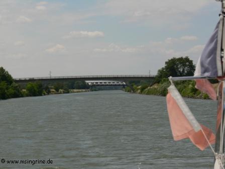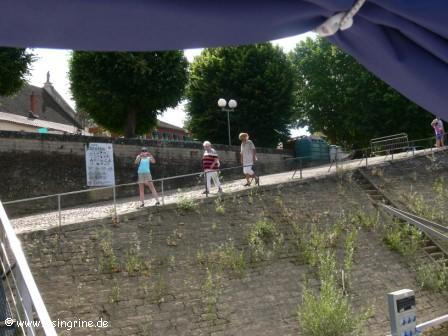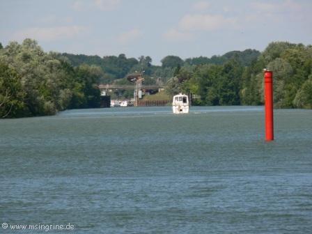 Nach der Mittagspause näherten wir uns bereits Saint Jean de Losne, es war ja auch nur eine kurze Strecke bis dorthin. Einen möglichen Halt hatten wir hier nicht eingeplant, da an diesem Wochenende das Schifferfest stattfindet, dementsprechend war der Quai National für die Veranstaltung gesperrt. Die Kirche von St. Jean strahlte heute passend zum Festtag im Sonnenlicht hell erleuchtet auf. Da es auch hier heute sehr warm war, waren in der Mittagszeit nur wenige Leute auf den Straßen unterwegs. Das würde sich wohl am Nachmittag ändern. Wir hatten die Fahrt vermindert, um das Geschehen am Ufer etwas in Bildern einfangen zu können, aber es ging dann ohne Halt weiter Richtung Süden. Ab ging es in den Zuführkanal Richtung der Schleuse von Seurre. Die letzten Kilometer zur Schleuse sind sehr eintönig, es geht hier etwa 8 Kilometer stur geradeaus, der letzte Teil entlang durch Spundwände, da die Uferbefestigung einmal nachgegeben hatte. Über Funk hatte ich die Ingrine angemeldet und wir brauchten kaum zu warten , bis wir mit unserer Schleusung an der Reihe waren. Vor einem Jahr hatten wir versucht hier zu halten, aber keinen Platz mehr bekommen und so mussten wir damals weiter fahren. Aber diesmal hatten wir uns den besten Platz ausgesucht. Es erfolgte ein Stadtrundgang durch die beschaulichen Straßen und Gassen von Seurre, dann gab es an Bord das Abendessen. An der Barrage von Écuelles wurde immer noch gearbeitet. Die Bauarbeiten sind nun etwas 2 Jahre im Gange. Vorbei ging es an den Resten der alten Schleuse von Verdun, die auch wie fünf weitere alte Schleusen zwischen Auxonne und Ormes durch den Bau der Großschleusen in Seurre, Ècuelles und Ormes überflüssig wurden. Für uns auch ein Wegweiser, gleich geht es Backbord quer ab weiter, Tagesziel erreicht. Danach kam für uns das Pflichtprogramm, hoch zur Capitainerie und ab in den Schatten, Eis und Waffeln riefen die Damen an den Tisch. Für mich gab es nur ein Glas Rosé. Na gut, können auch zwei Gläser gewesen sein, die Aufzeichnungen sind da etwas unpräzise . . . . Die Brücke führt unmittelbar an einer Häuserfront vorbei, an deren Fassade (von hinten, hier nicht sichtbar) eine Messlatte mit den Hochwasserpegeln der Vergangenheit angebracht ist. Dafür war an der Vorderseite zur Straße hin ein Verkehrszeichen angebracht bzw. aufgemalt. Eigeninitiative oder einfach kein Geld im Stadtsäckel ?? Auf halber Strecke biegt man dann links ab Richtung Rathaus und Schule. An dem selben Weg liegt auch das Brot- und Getreidemuseum. Hinter dem Brotmuseum gibt es einen Übergang über einen Altarm der Doubs, der aber nicht befahrbar ist. Eine Platanenbaumreihe führte uns dann zurück zum Zentrum des Ortes. So war fast eine Stunde vergangen. Um 17°° war so gut wie kein Platz mehr frei, dennoch kamen immer wieder Boote, die einen Platz suchten. Zur Not mussten diese dann weiter den Doubs hochfahren und oberhalb dann wild ankern oder anlegen. Für uns gab es dann Abendessen und wir machten es uns auf dem Nildeck gemütlich. |