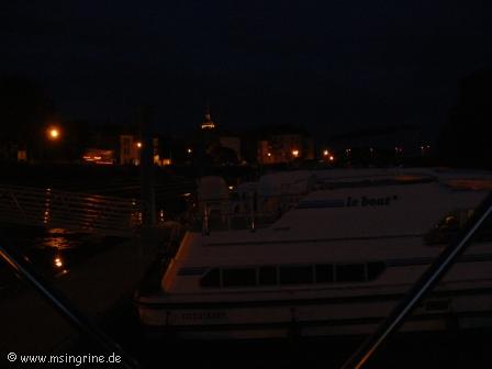 Um 21:10 kam dann doch tatsächlich noch so ein Scherzkeks in den Hafen und verlangte doch von uns, wir sollten mit unserem Boot einen anderen Platz aufsuchen, da sein MB eine Überbreite hätte, oben sei ja noch eine kleine Lücke. Ich gab ihm zu verstehen, das ich als verantwortlicher Schiffsführer nach dem Abendessen, da dann alkoholisiert, mein Eigentum keinen cm bewegen würde. Er versuchte dann oben an der Mauer, die für längere Pénichen vorgesehen ist, anzulegen, stellte sich dabei aber erster Klasse an. Mit dem Stromanschluss hatte er dann auch so seine Probleme, da an der Wand zwar eine Steckdose vorhanden war, diese aber in dem Schaltkasten darüber wohl abgeschaltet war. Man hätte ja auch einen Hafenplatz zu einer vernünftigen Zeit aufsuchen können . . . . |